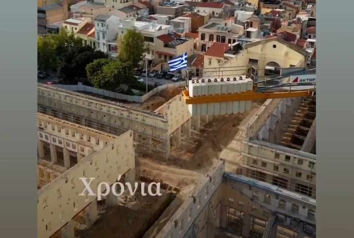 Στα Χανιά, ξεχώρισε η γαλανόλευκη που στήθηκε πάνω στον γερανό που βρίσκεται στο εργοτάξιο της Δημοτικής Αγοράς.